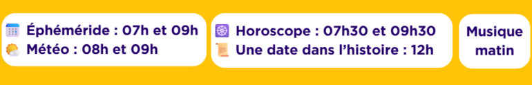 *Hors week-end (Horoscope 07h30 et 9h30 / météo 08h et 09h)
